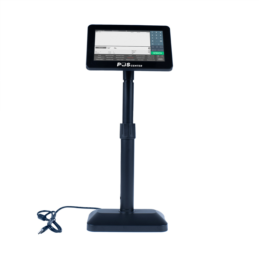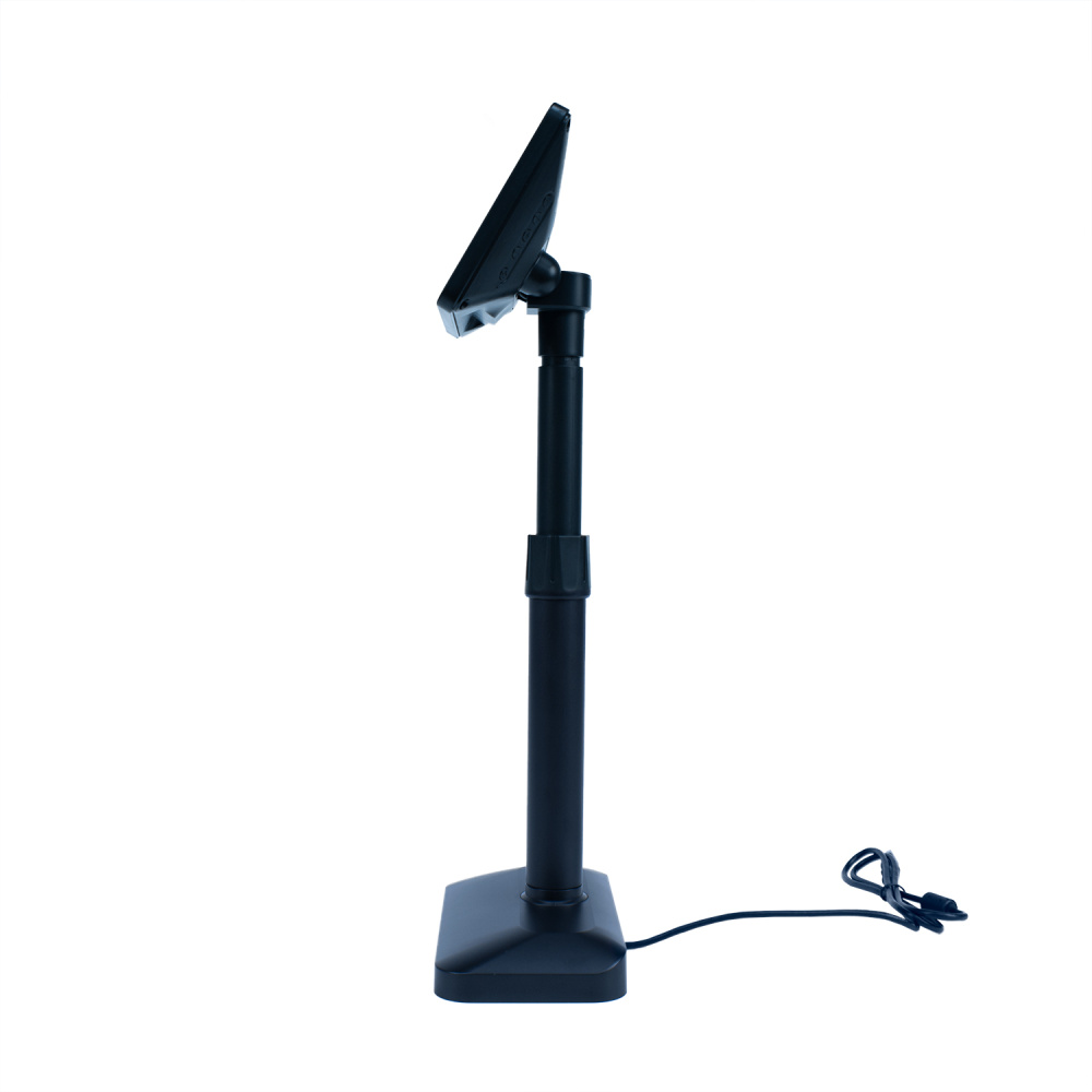 В комплекте поставки дисплея покупателя POScenter Vision 7” идёт телескопическая стойка с регулировкой высоты в диапазоне от 20 до 33 см. Для устойчивости конструкции в основании стойки предусмотрена металлическая пластина.