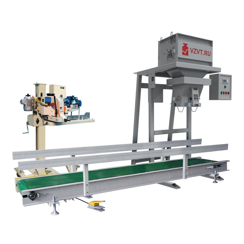 В линию включен дозатор для фасовки, транспортер для отвода мешка в зону зашивки и мешкозашивочная станция с регулировкой под высоту мешка.
